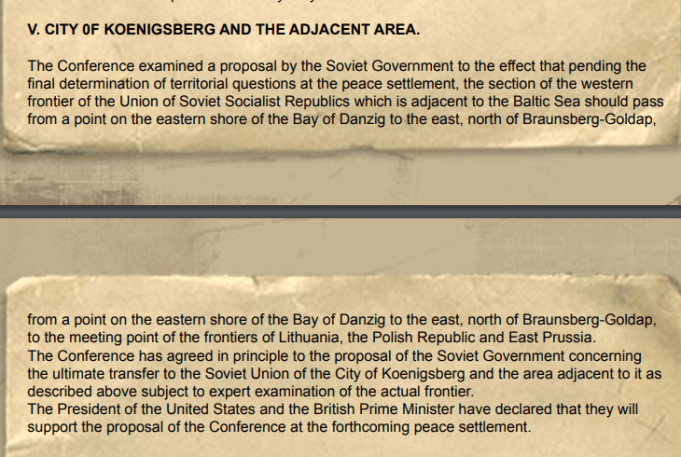 While the August 1, 1945 Potsdam Agreement called for transfer to the Soviets of Germany’s East Prussia region then known as Königsberg–which was the birthplace of Enlightenment philosopher Immanuel Kant—Potsdam did not call for Soviet annexation.