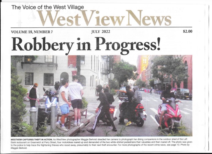 Former New York Times photo editor Maggie Berkvist, who died this past year, deserved a Pulitzer for her above photo published in West View News. She captured this “Robbery in Progress” in broad daylight last July, a couple of blocks from Manhattan’s Sixth Precinct in the West Village.