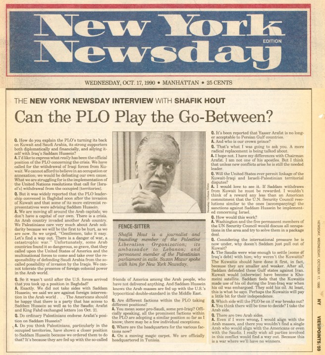In October 1990 during the buildup to the Gulf War, I asked Palestinian-American academic Edward Said, then a professor of literature at Columbia University, if he would direct me to the best Palestinian spokesperson he could think of to articulate the Palestinian struggle. Said referred me to journalist and PLO founding member Shafik Hout.